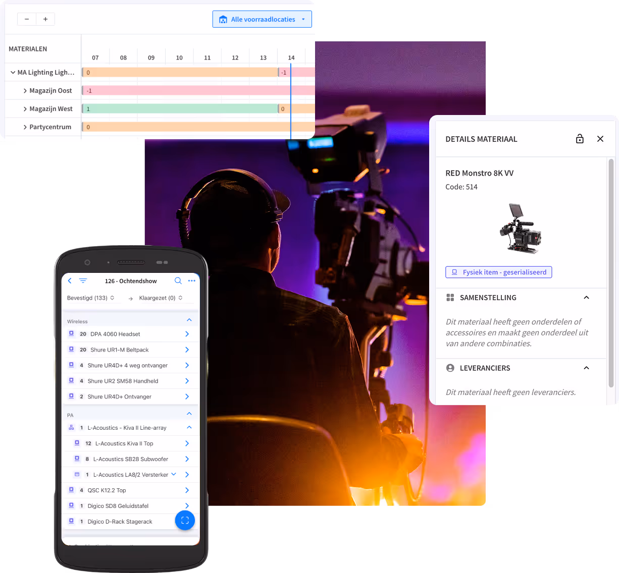 Verabschiede dich von der Verwaltung hochwertiger Materialien mit Tabellenkalkulationen oder veralteter Software. Verfolge die Verfügbarkeit von Kameras und koordiniere Materialien für Produktionen in Echtzeit mit Rentman.