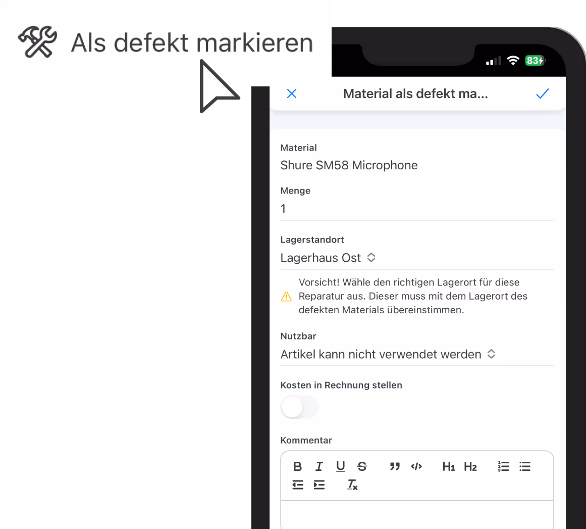 Verhindere Ausfälle am Set, indem du Reparaturen und Prüfungen nachverfolgst. Die Mitarbeiter können beschädigtes Material direkt über die App melden und es sofort als nicht verfügbar markieren, damit es nicht für einen neuen Auftrag eingeplant wird.