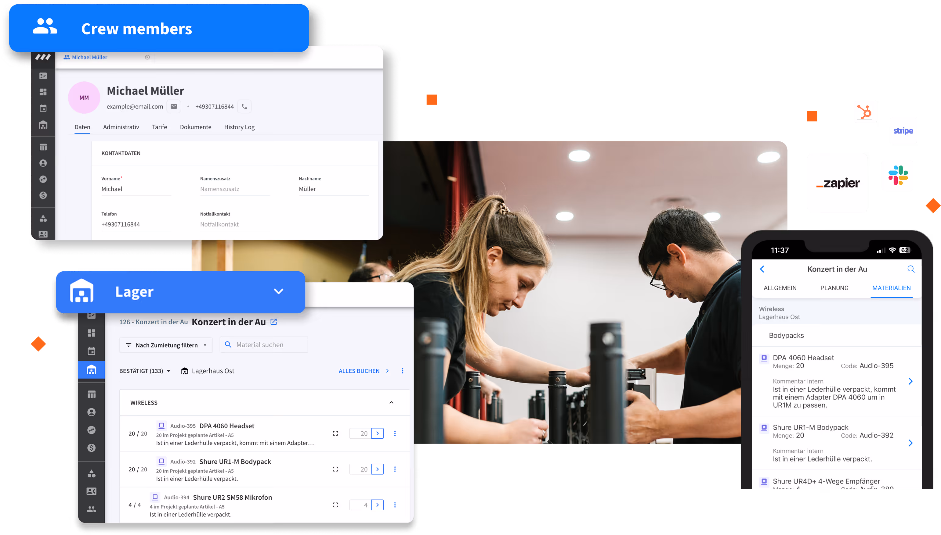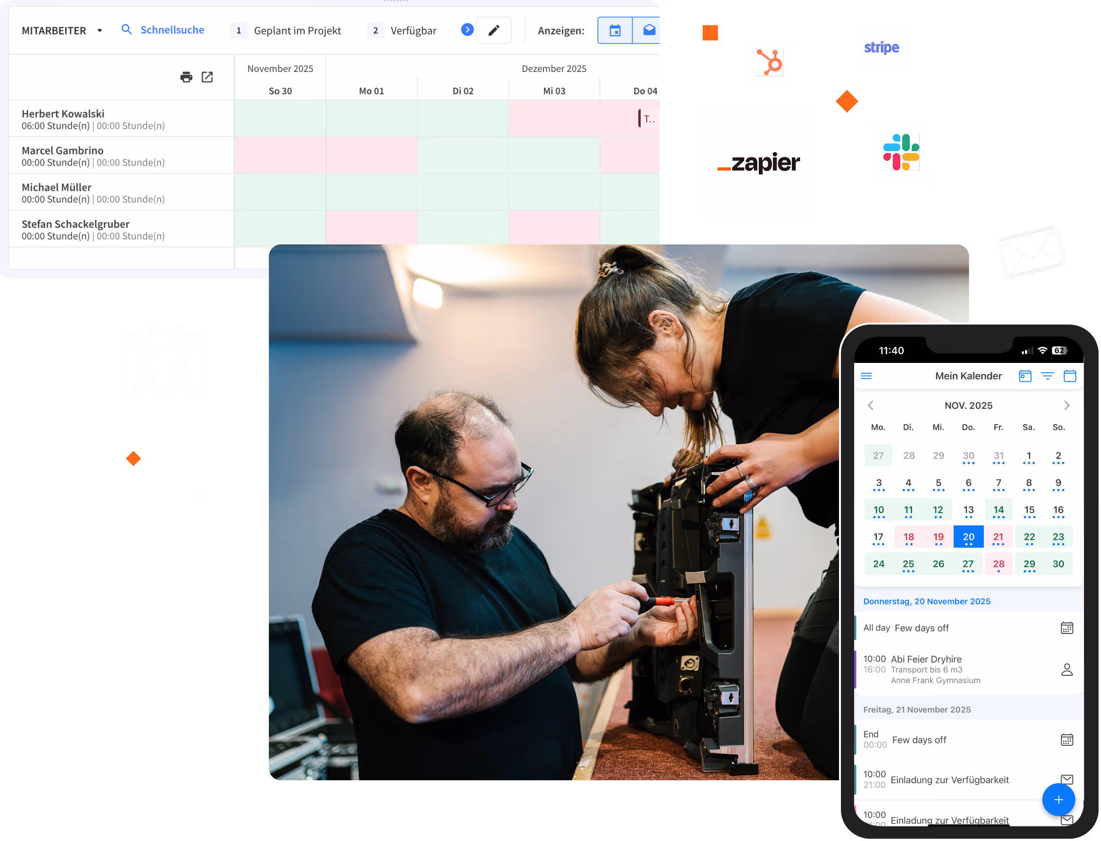 Eine Software zur Personalverwaltung schafft eine einzige Informationsquelle, die Planer, Lagerteams und Mitarbeiter miteinander verbindet. Anstatt sich auf separate Tools für die Planung, Bestandsverwaltung und Kommunikation zu verlassen, greifen alle auf dieselben Echtzeitinformationen zu. Wenn ein Planer in Rentman ein Projekt ändert, wird die Packliste im Lager automatisch aktualisiert und die Mitarbeiter erhalten eine Benachrichtigung auf ihrem Smartphone – so werden Missverständnisse und Fehler vor Ort vermieden, die durch langwierige Absprachen entstehen können.