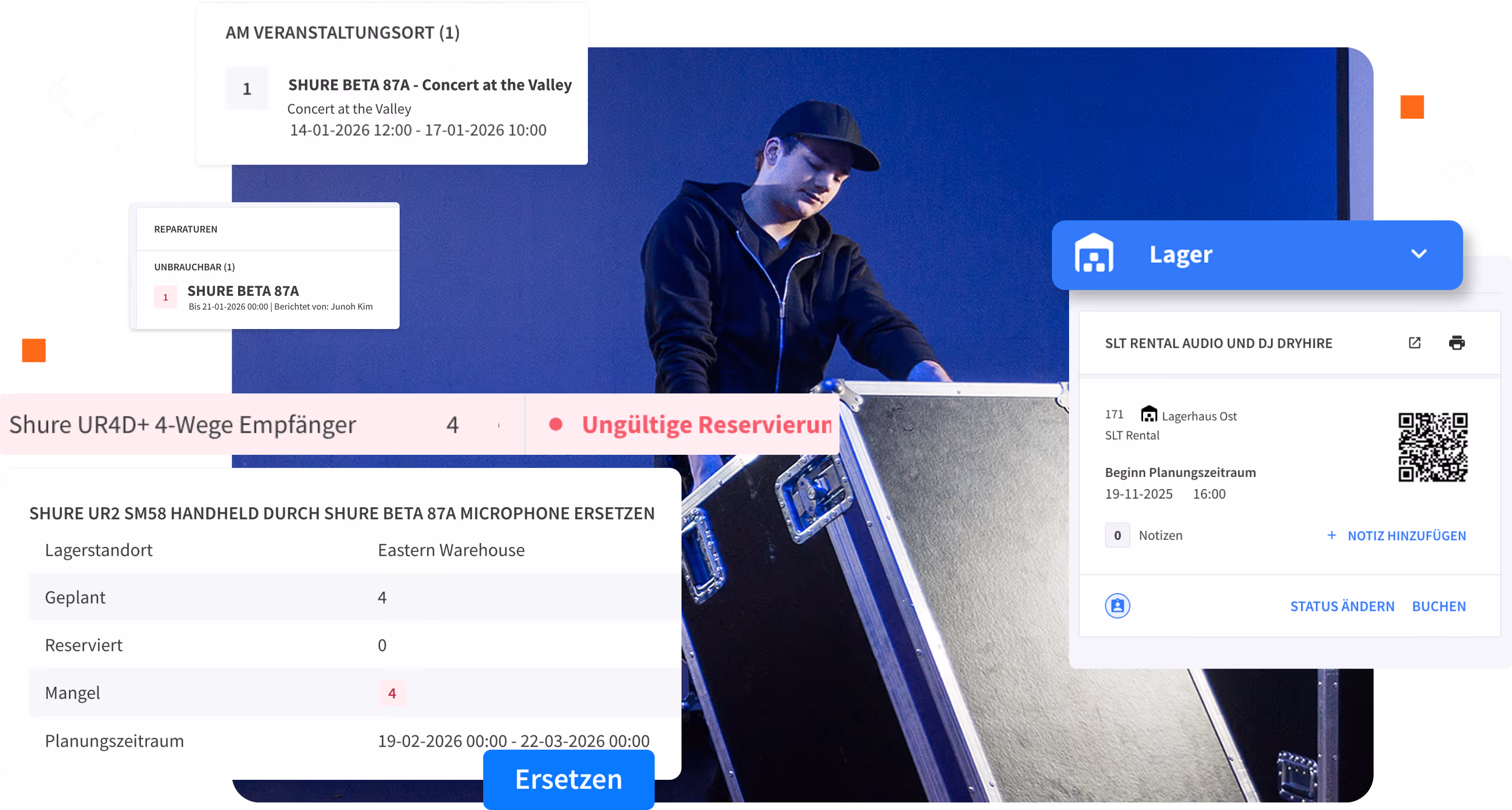 Verwalte dein gesamtes Material an einem Ort. Sieh die Verfügbarkeit in Echtzeit über alle Standorte hinweg, behebe Mängel und vermeide Doppelbuchungen.