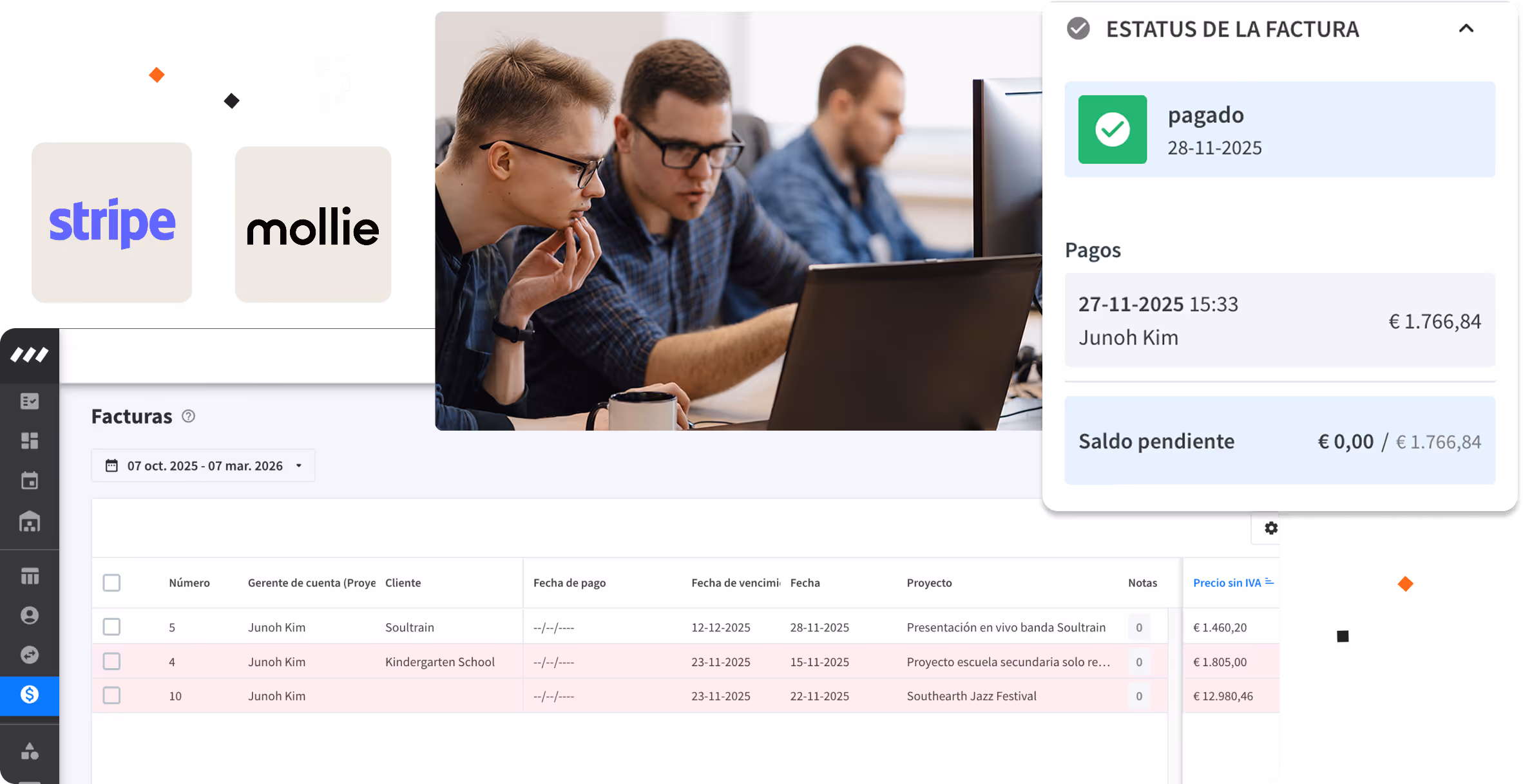 Cobra las facturas más rápido, permitiendo a los clientes pagar en línea a través de las integraciones de Mollie o Stripe.