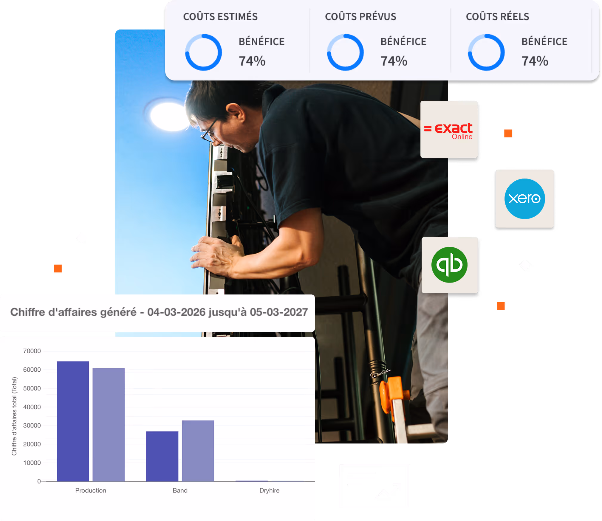 Oui. Rentman s'intègre directement à QuickBooks, Exact Online et Xero, ainsi qu'à plus de 7 000 applications via l’API et Zapier. Les factures se synchronisent automatiquement et le statut des paiements est mis à jour en temps réel, sans transfert manuel entre les systèmes.