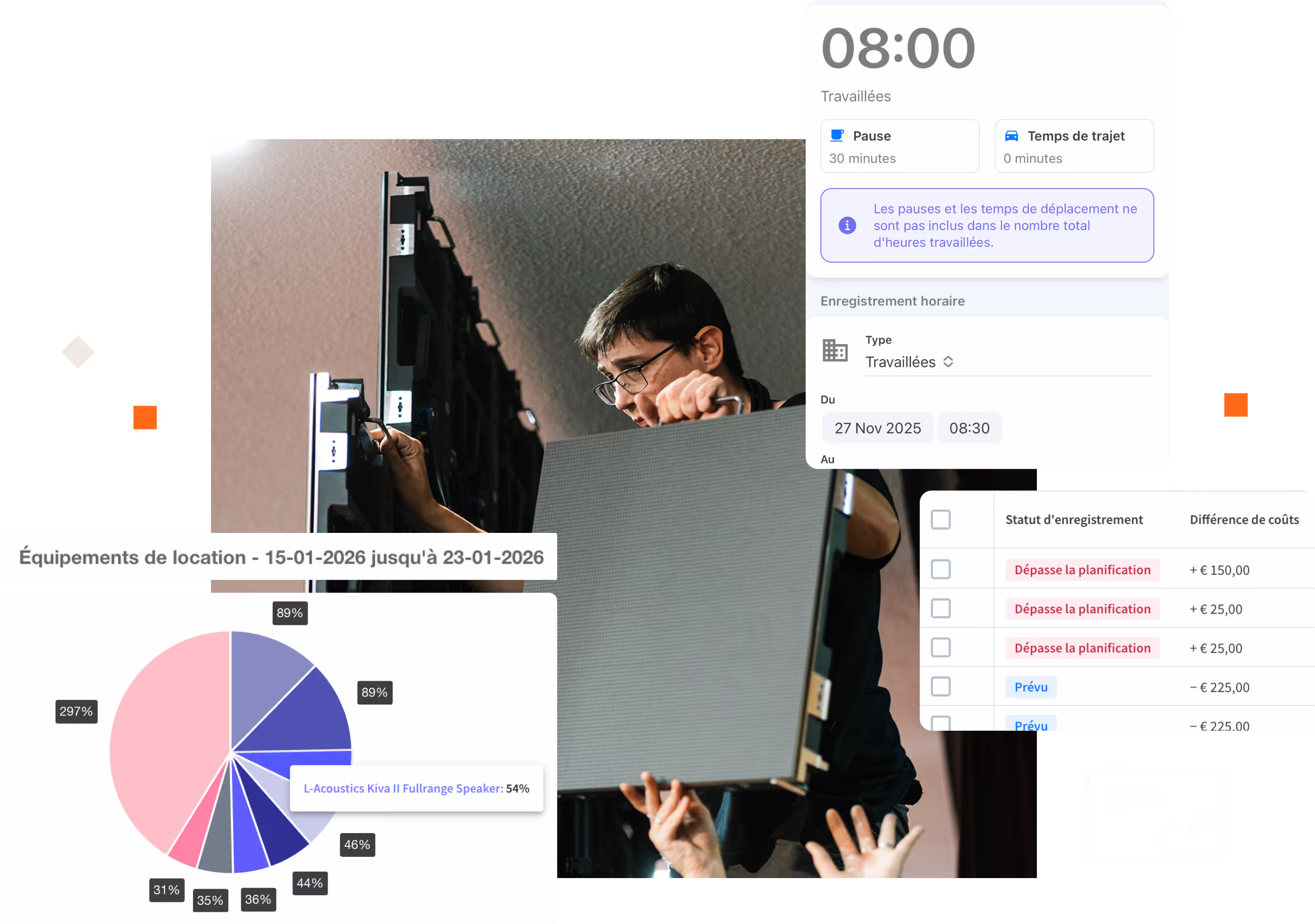 Les risques les plus importants pour les marges sont les heures supplémentaires non suivies, les changements de gamme non tarifés et les coûts de sous-location invisibles. Rentman automatise le calcul des heures supplémentaires, recalcule les coûts en cas de changement et suit les équipements sous-loués au niveau du projet, transformant ainsi la gestion financière en un avantage permanent.