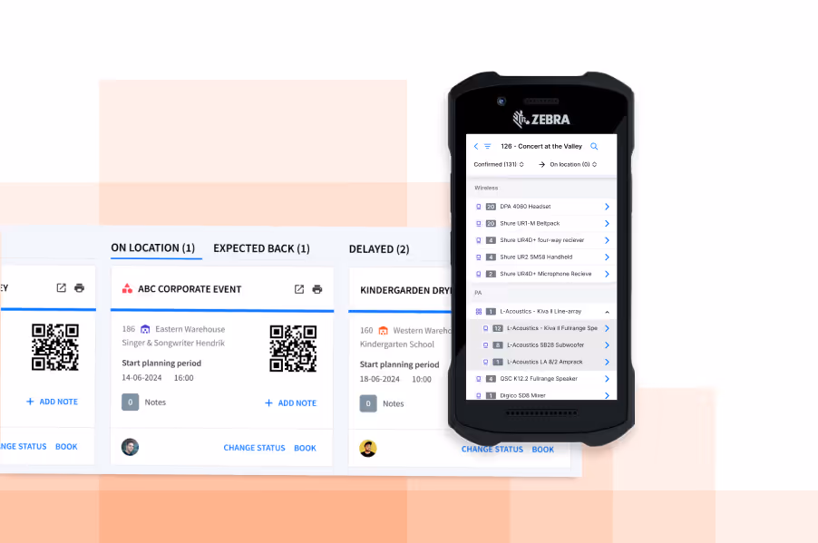 Il personale ha accesso gratuito all’app Rentman, dove può consultare liste di imballaggio digitali, scansionare codici QR, vedere foto del materiale e istruzioni di movimentazione, e aggiornare lo stato degli articoli in tempo reale.