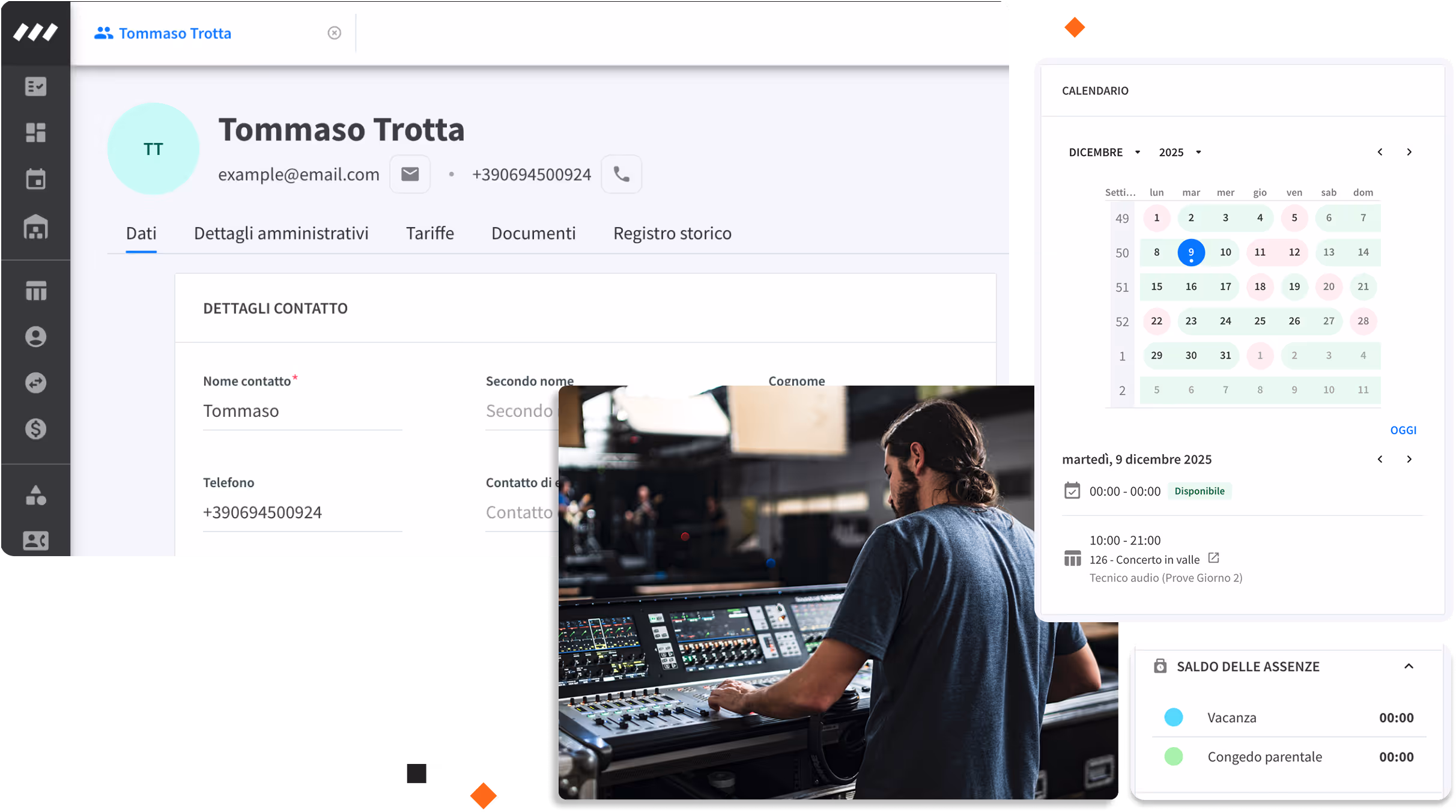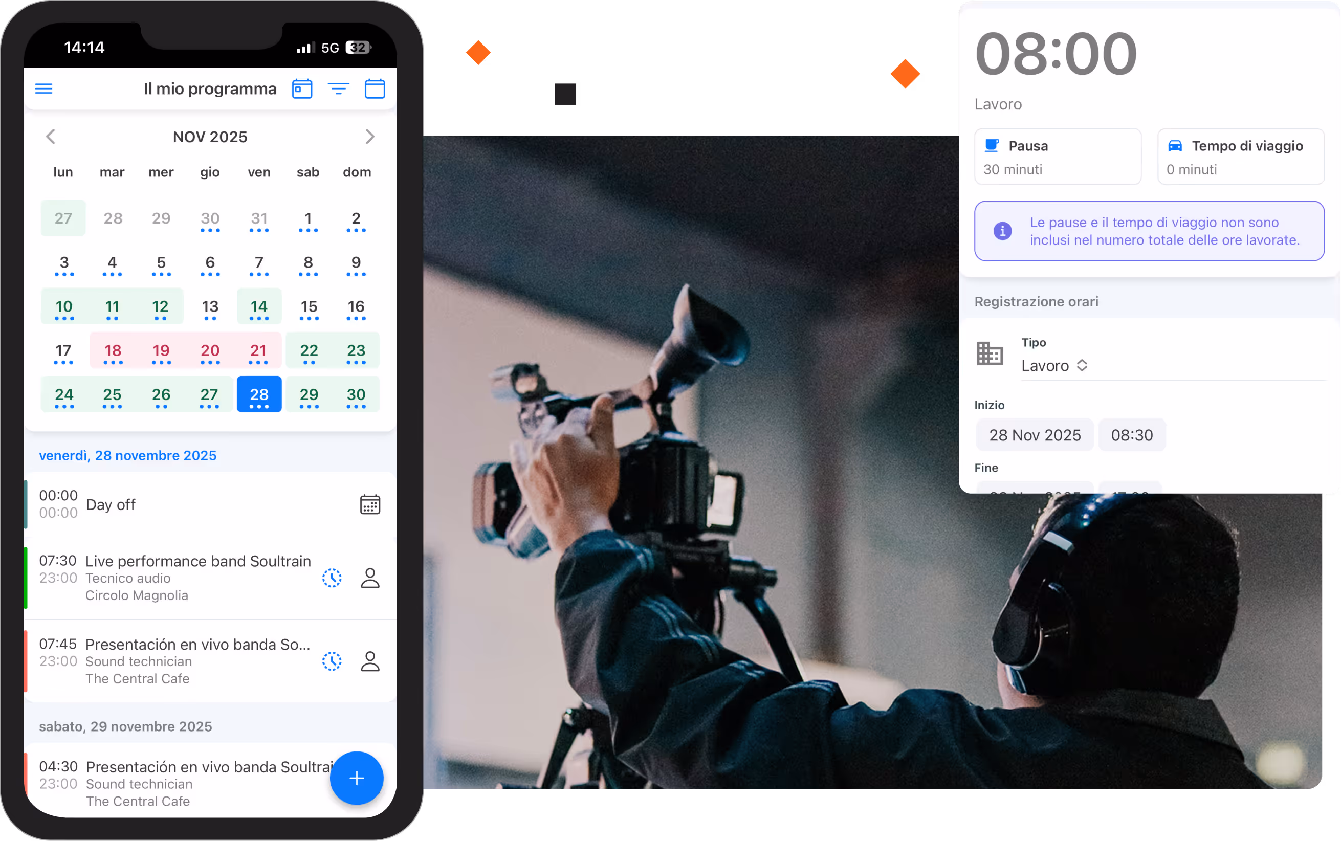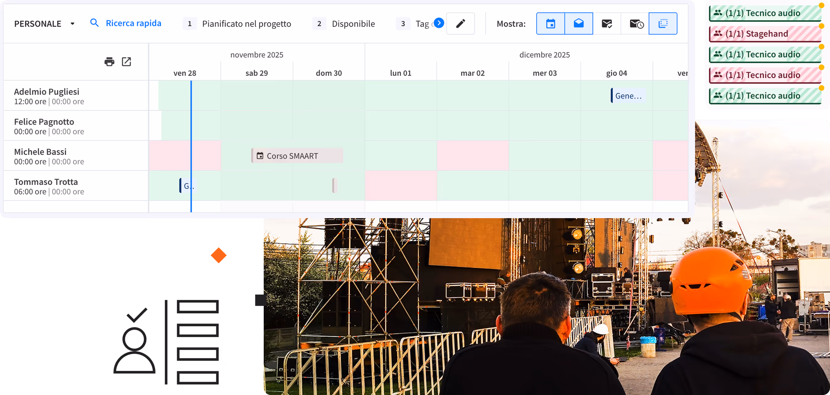 Aiutiamo i team di eventi live e produzioni media a programmare il personale giusto, comunicare più efficacemente, gestire cambiamenti dell’ultimo minuto e monitorare le ore lavorate.