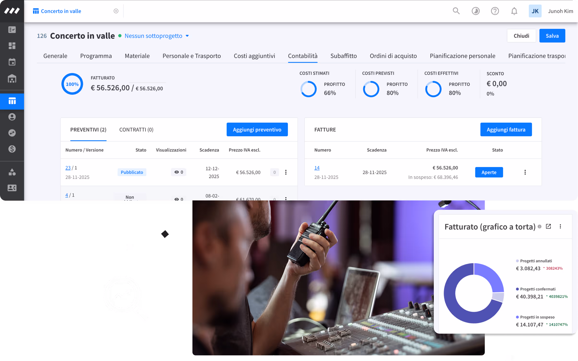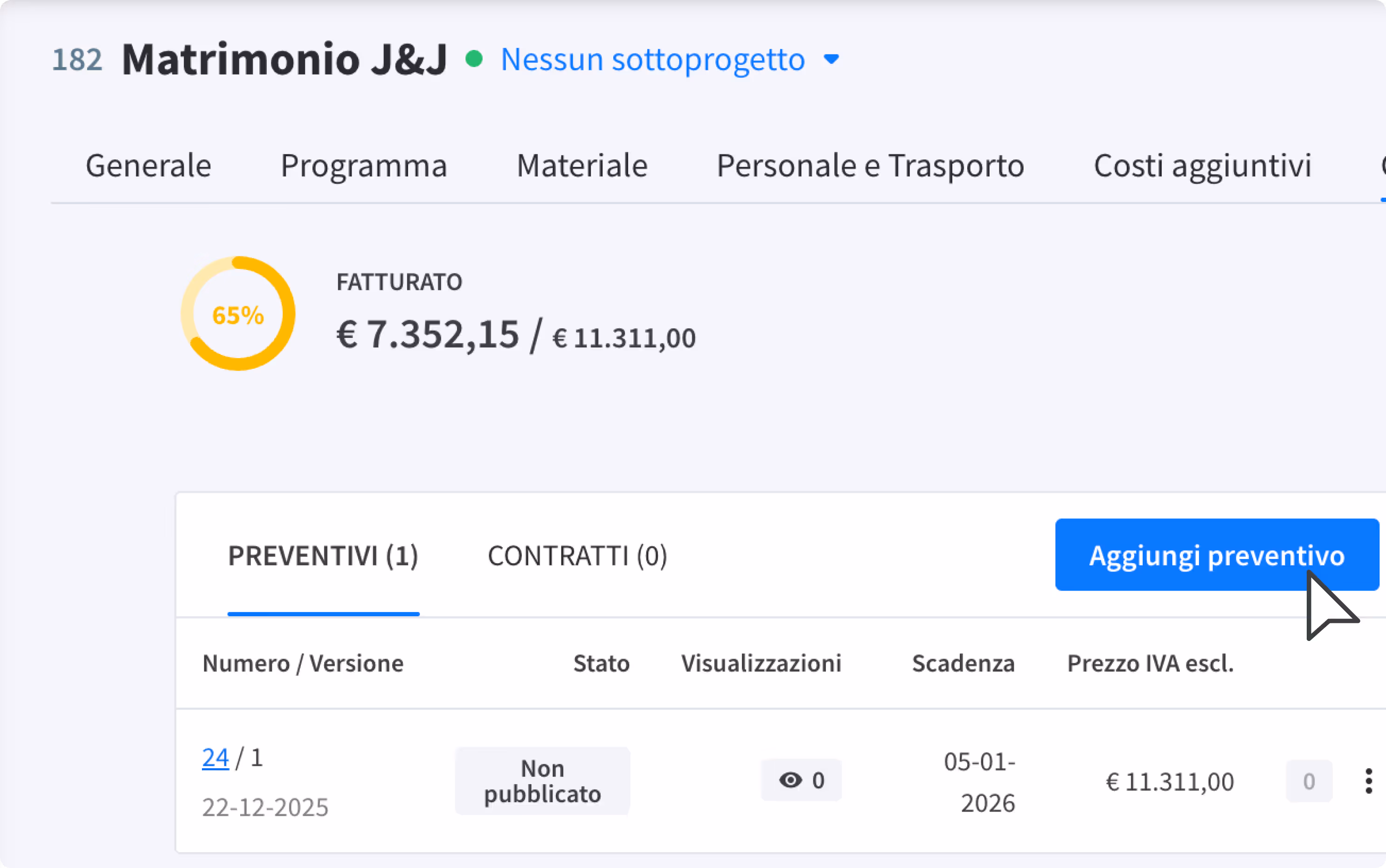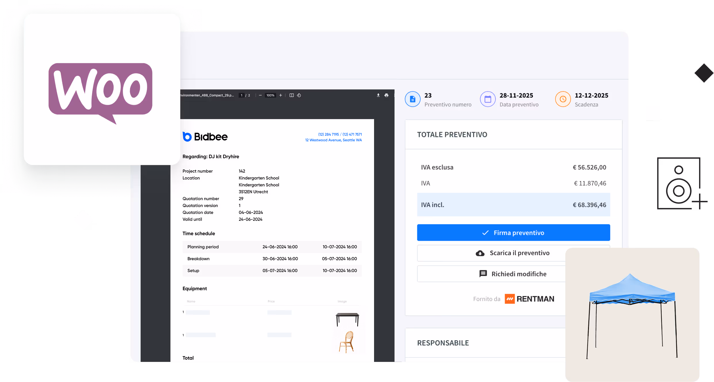 Crea preventivi per il noleggio di materiale per eventi inpochi minuti grazie a modelli riutilizzabili. Invia le offerte online epermetti ai clienti di approvarle con un solo clic. Meno e-mail, meno errori,più prenotazioni confermate.