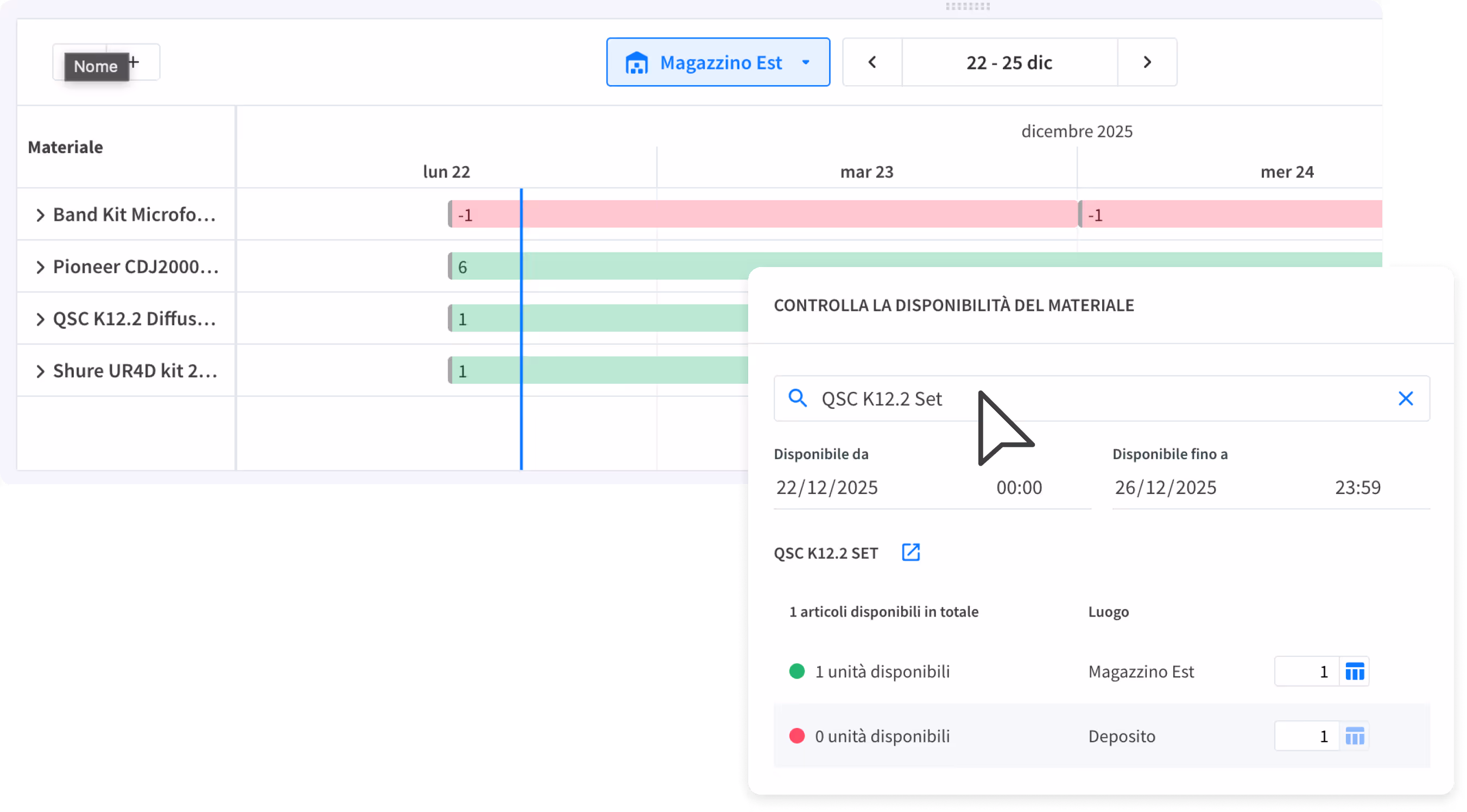 Gestisci tutto il tuo materiale in un unico sistema. Tienitraccia degli articoli, verifica la disponibilità in tempo reale su più sedi edevita le doppie prenotazioni.