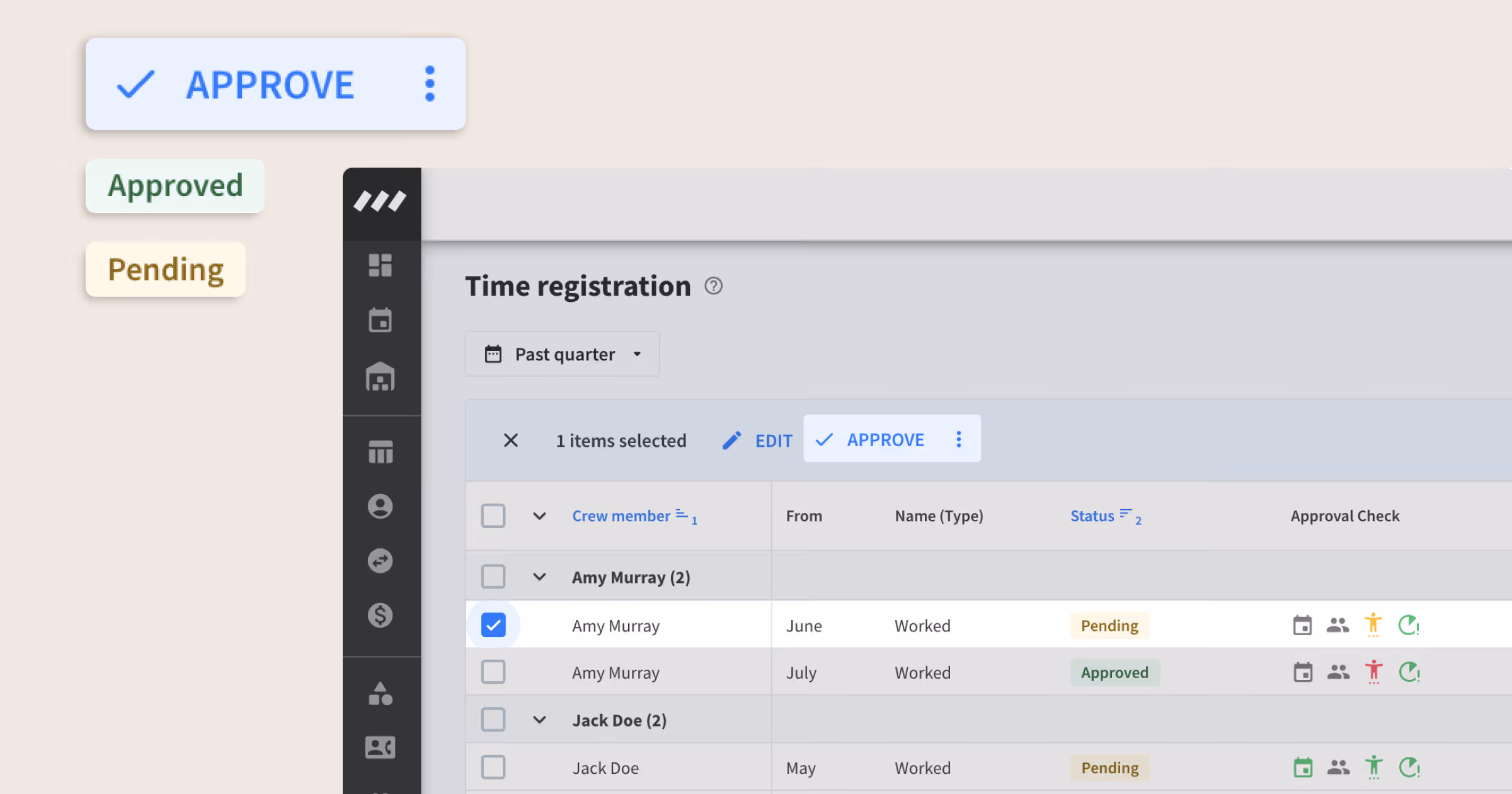 Een voorbeeld: je geluidstechnicus was ingepland voor 8 uur op een bedrijfsevenement, maar heeft 10 uur gewerkt vanwege extra voorbereidingstijd. Met de goedkeuringsfunctie ingeschakeld, zie je het verschil direct, check je dit bij de projectplanner en keur je de juiste 10 uur goed, allemaal voordat de salarisadministratie wordt uitgevoerd.