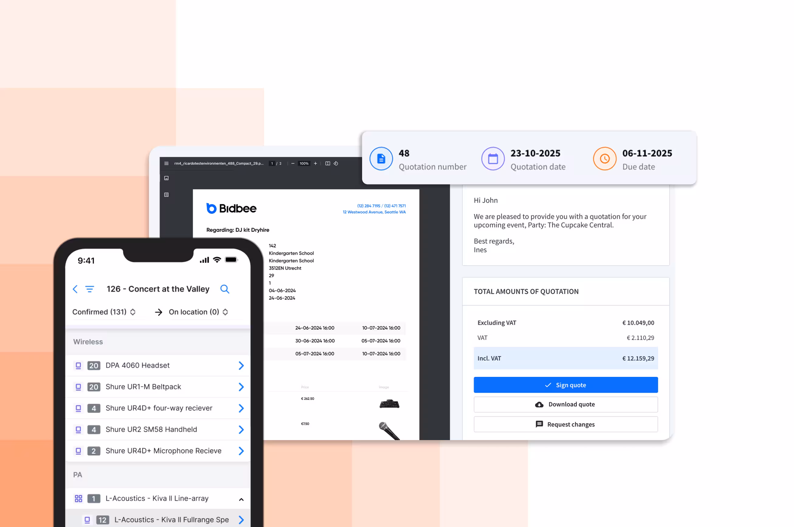 Laat klanten rechtstreeks op jouw website items bekijken, aanvragen indienen of offertes aanvragen. Alle aanvragen worden automatisch gesynchroniseerd met Rentman, wat telefoontjes bespaart en je inbox chaosvrij blijft.