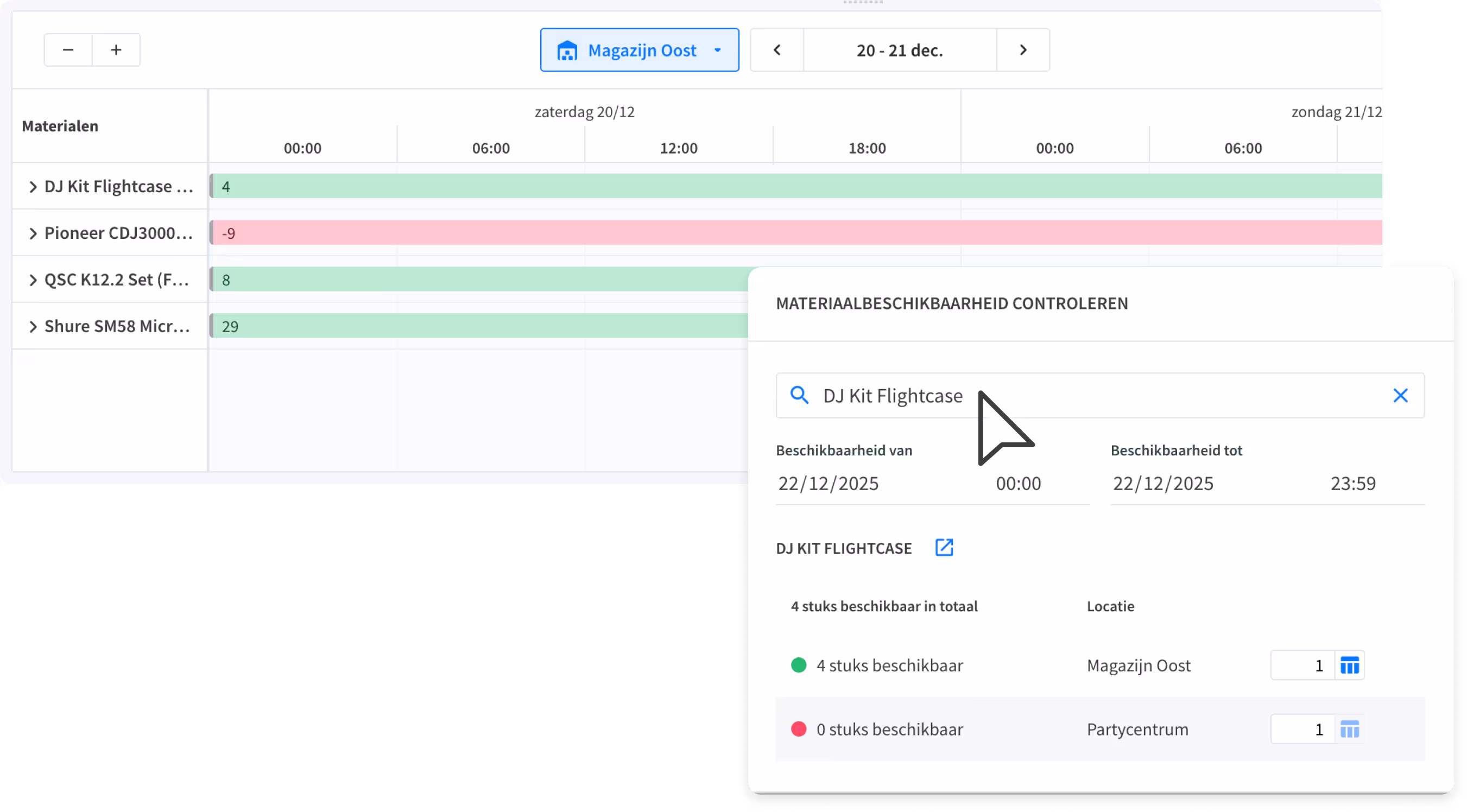 Beheer alle materialen vanuit één platform. Track items,bekijk beschikbaarheid realtime op verschillende locaties en voorkom dubbeleboekingen.