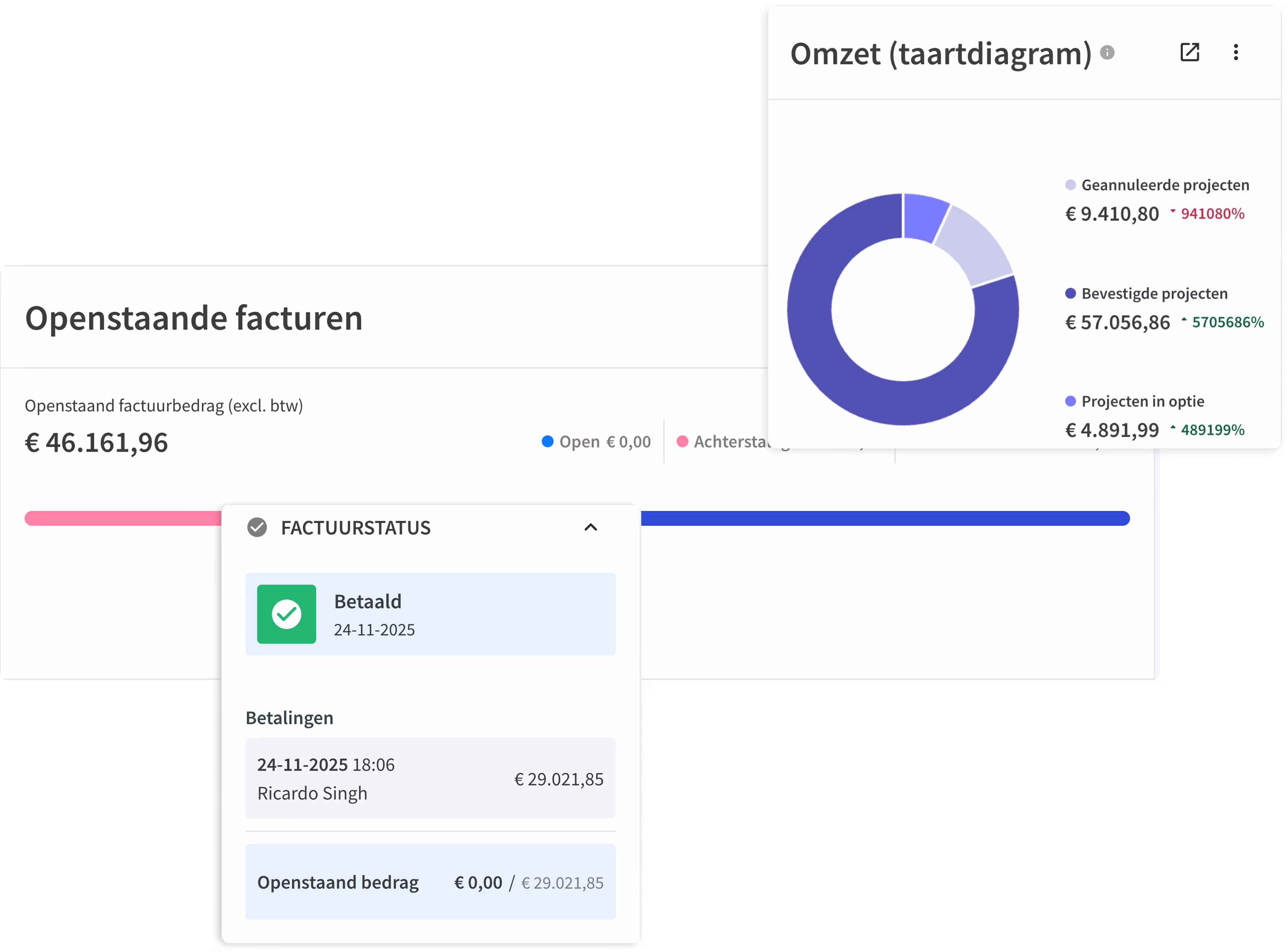 Genereer facturen op basis van je projectplanning en verstuur direct betalingsverzoeken. Laat klanten online betalen en voorkom late of onvolledige betalingen.
