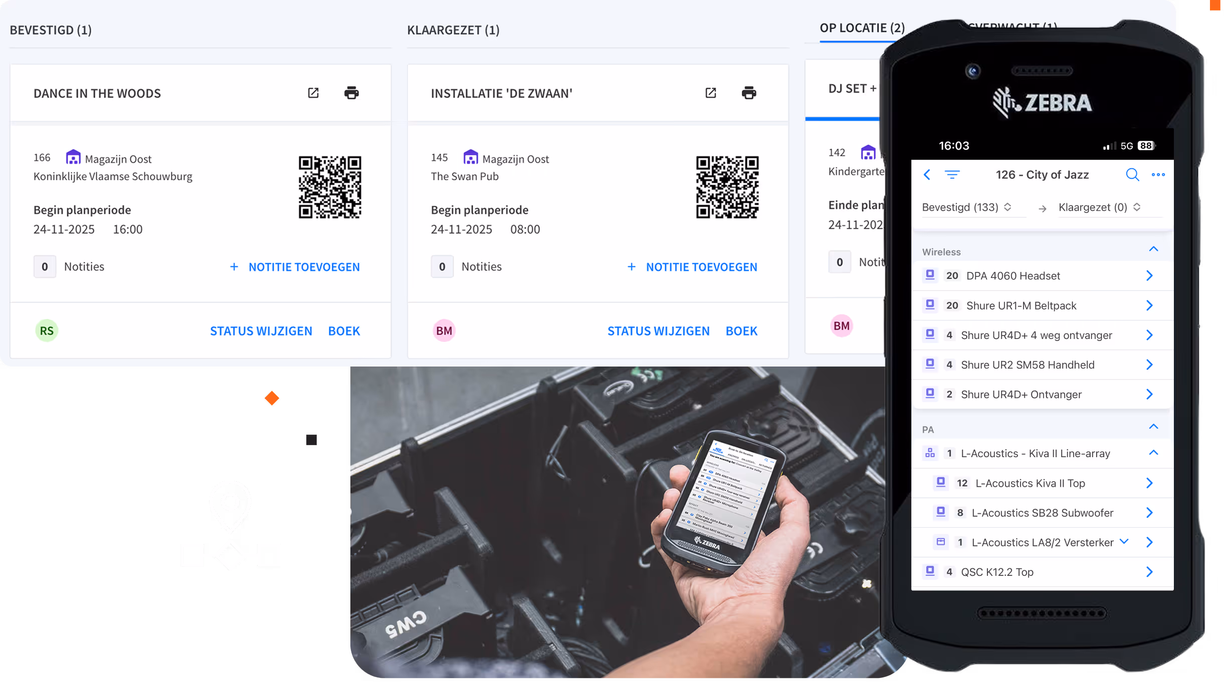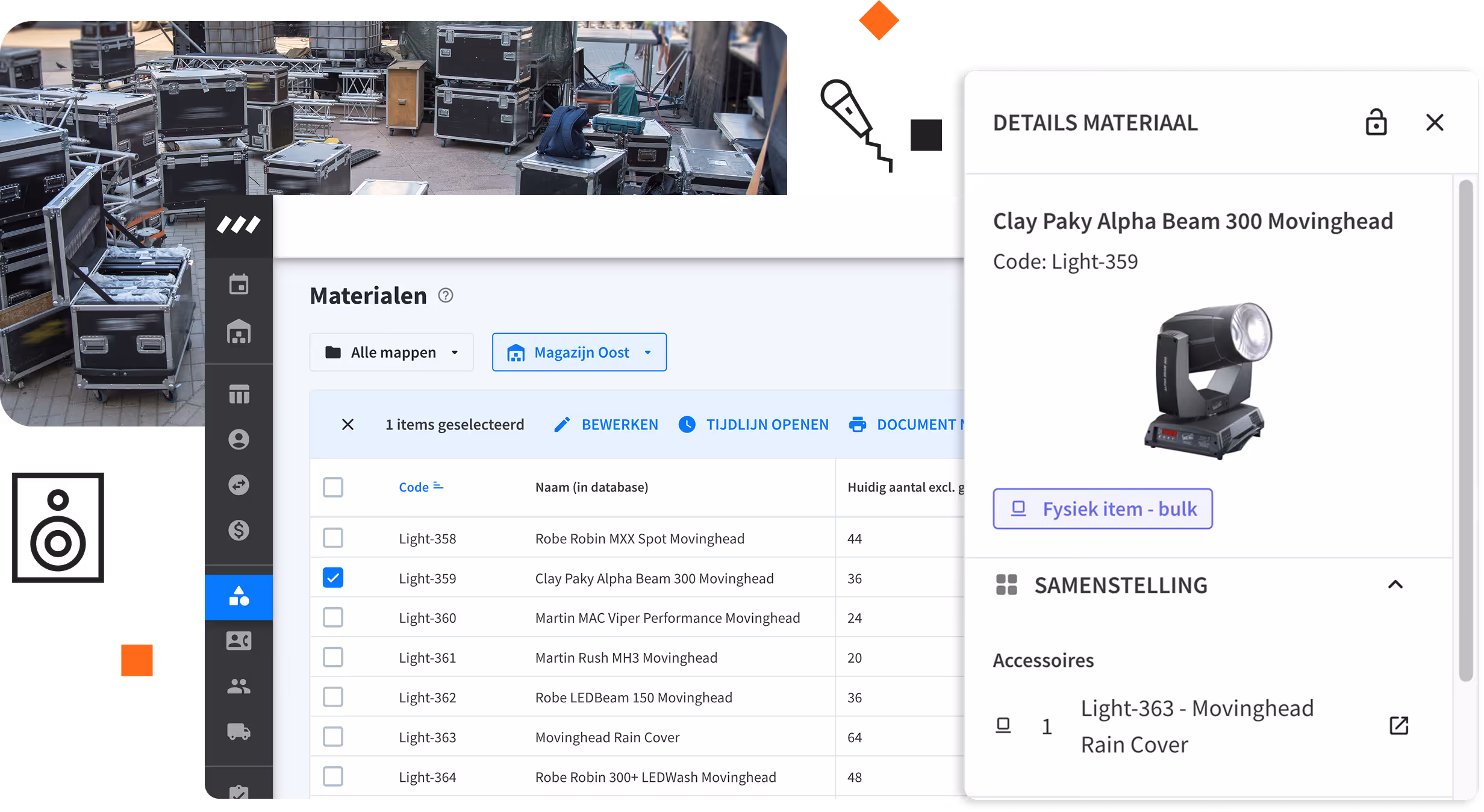 Wij helpen live event & mediaproductieteams met voorraadbeheer, verwerken van last minute reserveringen, het inpakken van de juiste items en in realtime volgen van materiaal.