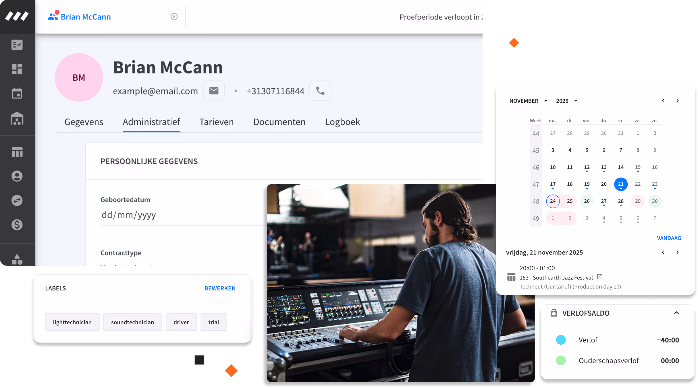 Wij helpen live event- & mediaproductieteams met het inplannen van de juiste medewerkers, efficiënter communiceren, omgaan met lastminutewijzigingen en het bijhouden van arbeidsuren.